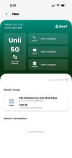 The Smart App makes it easy to monitor your Smart Home WiFi usage anytime. In just a few taps, you can check your data allocation, active add-ons, and recent transactions.