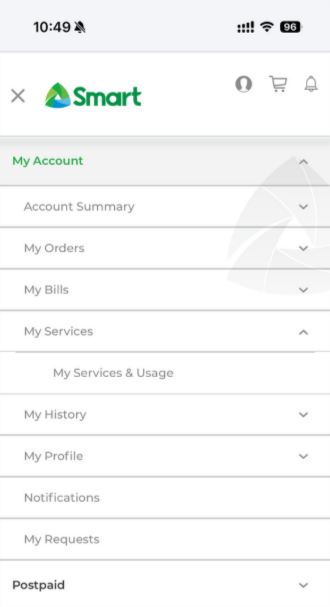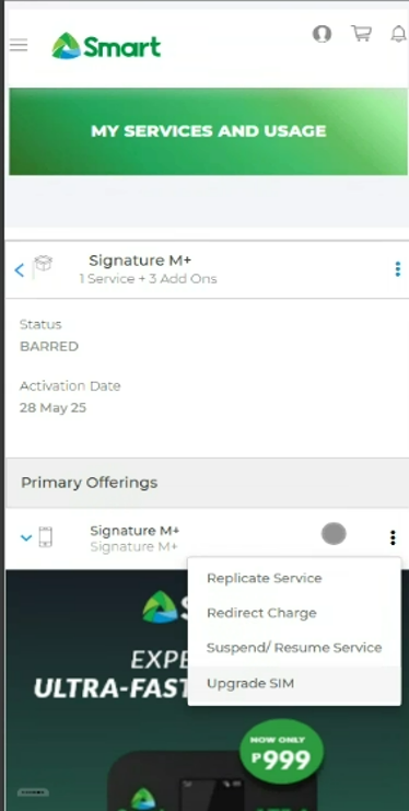 2. Go to My Account > My Services > My Services and Usage, tap on the 3 dots or ellipses beside your Postpaid Plan name, then tap Upgrade SIM.
